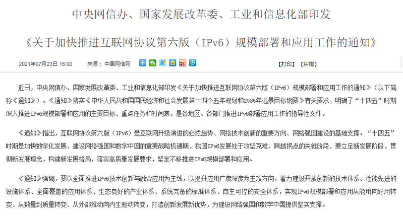 近日,中央網信辦、國家發展改革委、工業和信息化部印發《關于加快推進互聯網協議第六版(IPv6)規模部署和應用工作的通知》(以下簡稱《通知》)。《通知》落實《中華人民共和國國民經濟和社會發展第十四個五年規劃和2035年遠景目標綱要》有關要求,明確了“十四五”時期深入推進IPv6規模部署和應用的主要目標、重點任務和時間表,是各地區、各部門推進IPv6部署應用工作的指導性文件。《通知》指出,互聯網協議第...